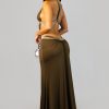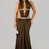 Romantic and mysterious, this olive-brown dress evokes midnight garden walks. The stretch fabric hugs in all the right places while the flowing design adds movement and grace.